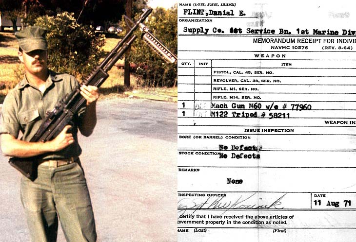 Daniel E. Flint *** U.S. Marines *** Vietnam 1969-1972 Drafted into the Marines October 1, 1969, Dan entered Parris Island, South Carolina for basic training graduating on December 3, 1969. With MOS specialities of 0331, M-60 Machine Gunner and 2300 Explosive Ordinance, he was stationed at Camp Lejuanue, North Carolina with the 1st Marines, 3rd Marine Division. Continued to Camp Pendleton California for extensive M-60 training 1970-1971 and (EOD) Explosive Ordinance Disposal at Camp Hansen, Okinawa August-September 1971. His South East Asia (SEA) tour started at DaNang, Vietnam bumping down it's coast as a Machine gunner on the LST Tuskluska. Upon reaching Thailand he was transferred inland to Nam Phong, Thailand from 1971-1972 where he loaded and fused 250 & 500lb bombs on A-6 "Intruders" and F-4 "Phantoms"aircraft. He was honorably discharged as a E-5 Sergeant in October of 1972.
